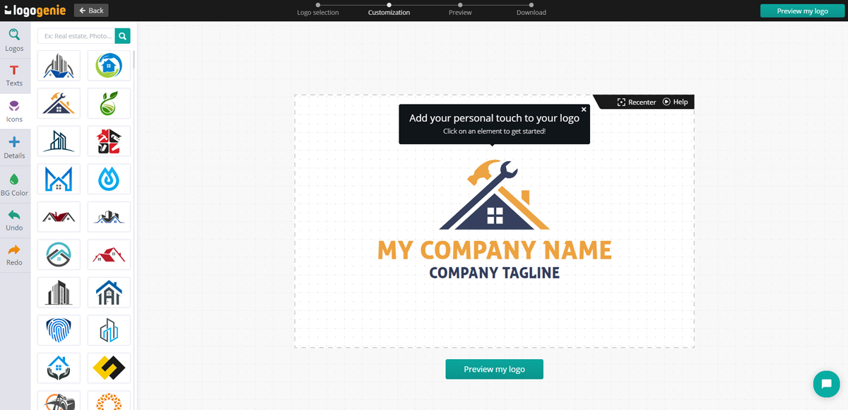 Certaines créateurs de logo, comme ici à Logogenie, possède une très vaste bibliothèque de polices, d’images et de modèles que vous pouvez utiliser, contrairement à d’autres…
